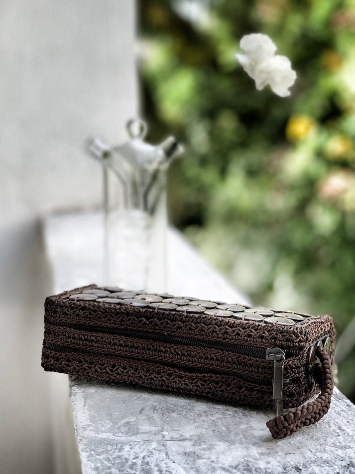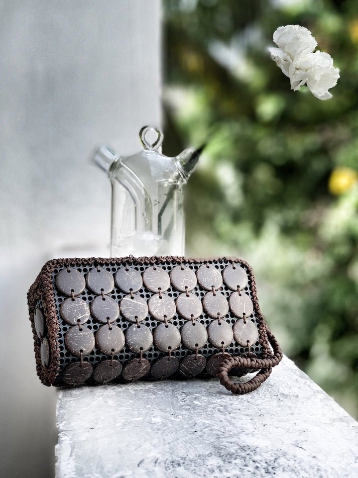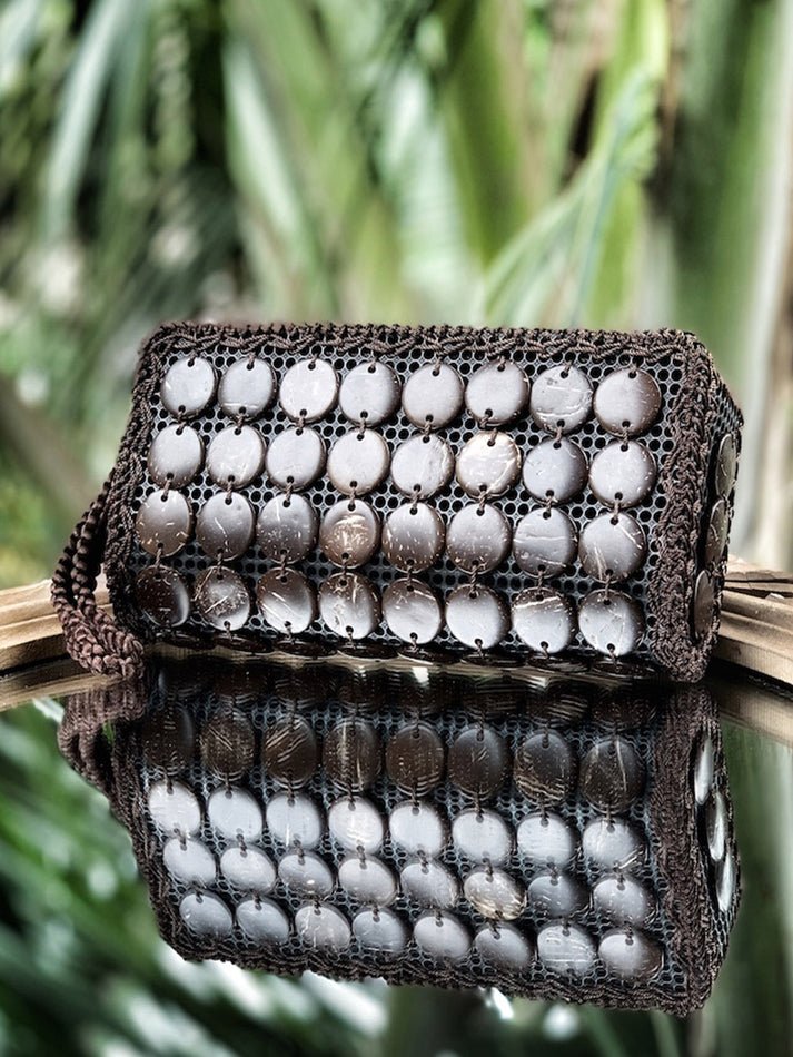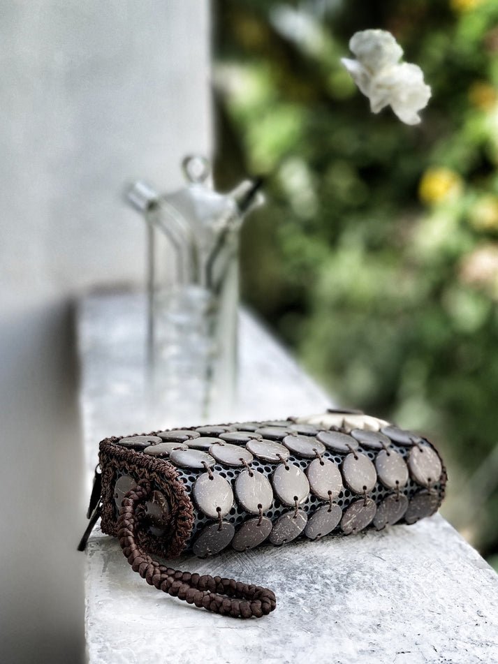 • It is a compact double pocket clutch with a strap for secure grip around the wrist. Strong, heavy zip-chain and premium quality coconut shells with a smooth, glowing finish.