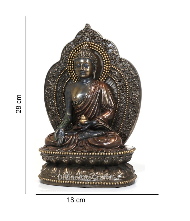The Medicine Buddha is, as the name implies, the Healing Buddha. In the traditional paintings he is surrounded by various herbs and medicine, with halos of healing energy radiating from his head and body. Usually portrayed the Medicine Buddha's right hand is resting on his knee in the mudra of blessings, with a stem of a healing plant in between his thumb and forefinger.