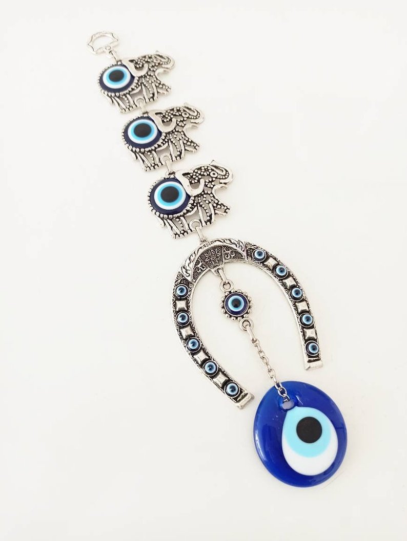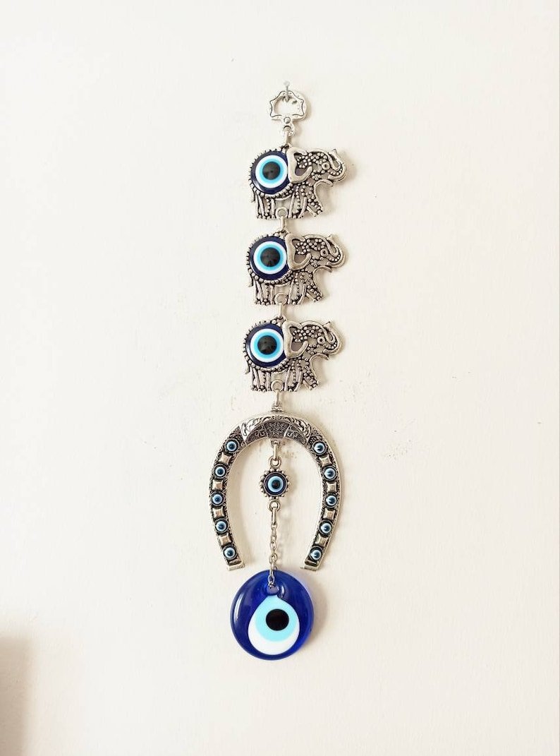 • Material: Metal.• Handmade.• Height of the Horseshoe with Three Elephants Decor is 28 cm(11 in)• This talisman is great for home protection.
